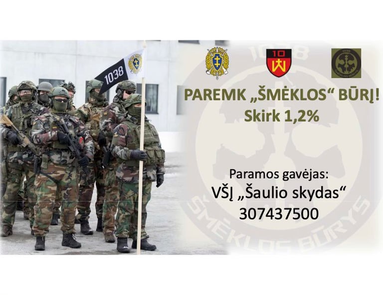 Kiekviena treniruotė, mokymai ir pasirengimas veikti Tėvynės labui reikalauja ne tik ryžto, bet ir realios paramos. Skirdami 1,2 % GPM, prisidedate prie Šmėklos būrio mokymų, pasirengimo ir aprūpinimo.